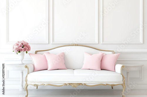 Elegant living room with pink pillows on white sofa