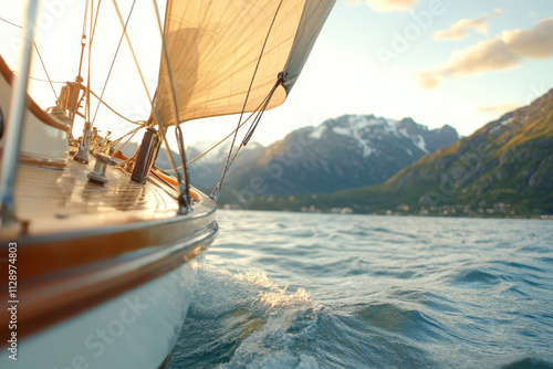 Sailing yacht glides through open sea during beautiful golden hour lighting
