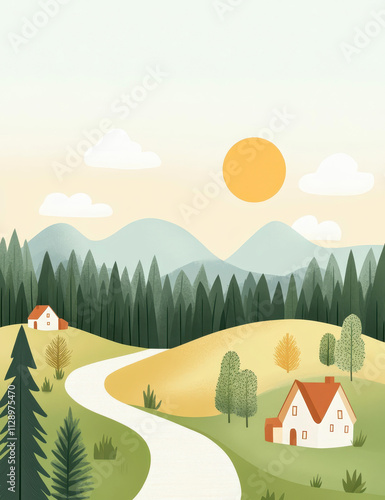 Rustic countryside panorama featuring scenic cottages and lush green hills on a sunny day