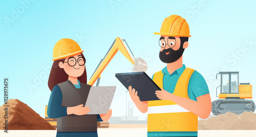 Construction workers collaborating on site with safety gear and technology