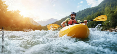 Adventurous man kayaking through turbulent river waters surrounded by scenic greenery