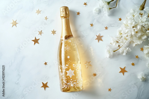 Golden champagne bottle with star-shaped confetti on elegant marble surface