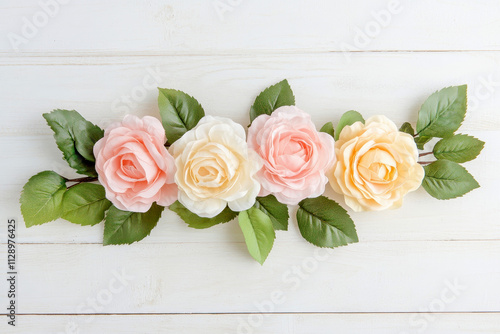 Pink and white roses arranged on a white wooden background