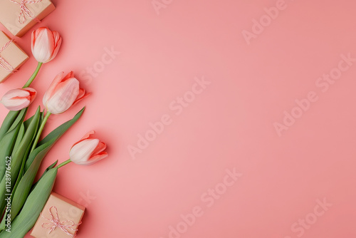 Pink tulips and gift boxes on a pastel pink background