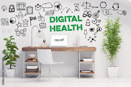 Arbeitsplatz mit Schriftzug Digital Health und Icons als Gesundheit Konzept