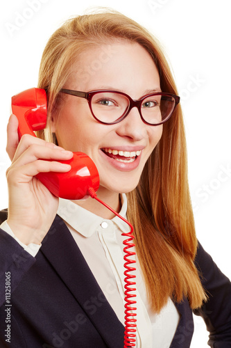 Zufriedene Geschäftfrau telefoniert über Festnetz