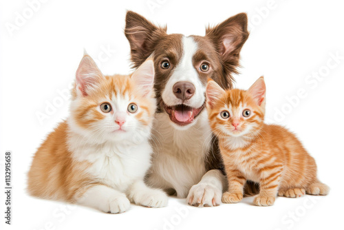 Adorable puppy and kittens playing together in a sunny outdoor setting