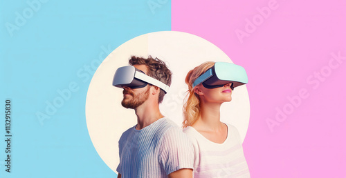 Man and woman experiencing virtual reality with colorful background