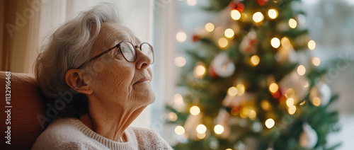 Elderly woman in cozy living room gazing at festive Christmas tree