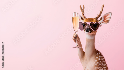 Deer with heart-shaped sunglasses holding a champagne glass on pink background