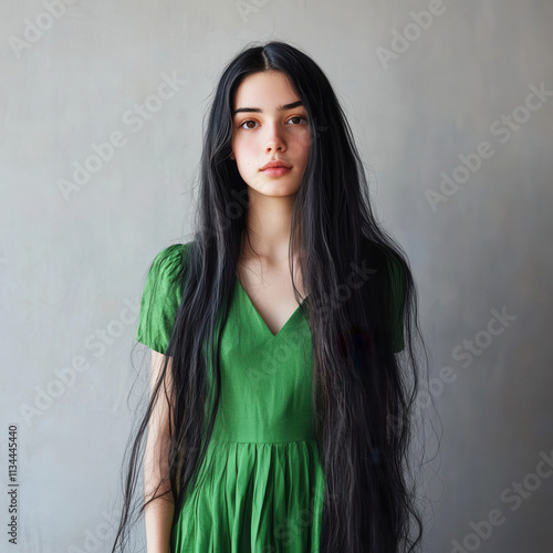 Serene portrait of a Middle Eastern woman in her 20s with long wavy hair and a calm expression