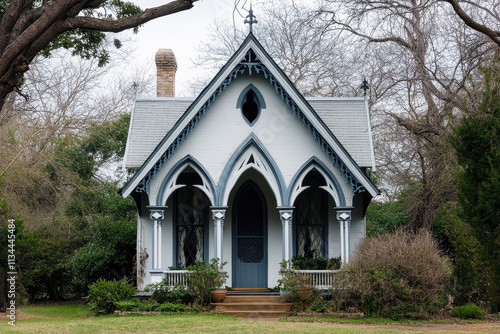 Charming Gothic Revival house from the 1800s amid lush greenery