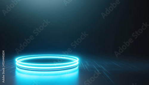 3D rendering of a futuristic podium with a metallic surface and glowing neon lights creating an ambient sci-fi atmosphere