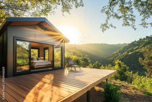 Modern cliffside cabin with ocean view at sunset in the 2020s