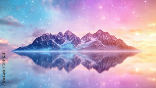 Majestic mountain mirrored on calm lavender and blue lake beneath starry sky