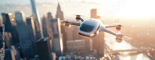 Futuristic flying car hovering above a modern cityscape during golden hour
