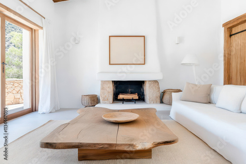Minimalist decorative console with framed art and branch arrangement on white wall