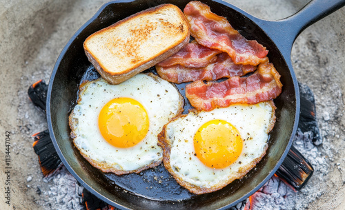 Rustic breakfast with bacon, eggs, and toast cooked over a campfire