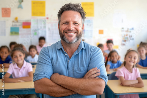 Confident black woman teacher standing in a classroom, arms crossed, with students in the background