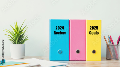 Colorful binders labeled 2024 review and 2025 goals organized on a desk