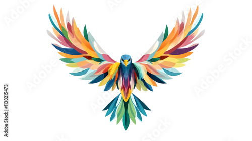 Colorful artistic hawk illustration featuring spread wings on a white background