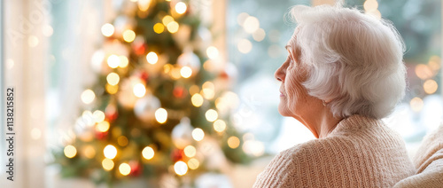 Elderly woman in cozy living room gazing at festive Christmas tree