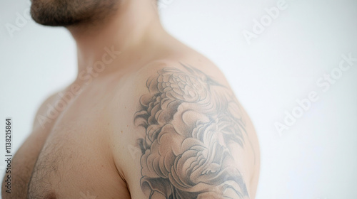 Closeup of a floral tattoo design on a man's shoulder