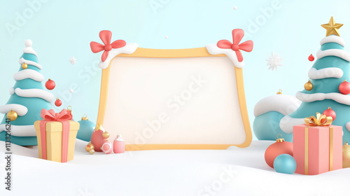 Festive Christmas scene with gifts and snow-covered decorated trees