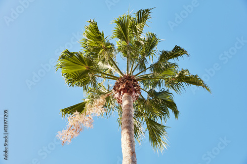 Frontal view of two Phoenix dactylifera date palm trees showcasing the lush green fronds against a pristine white background.