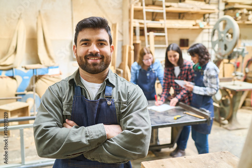 Experienced craftsman teaching young apprentice in a woodworking shop