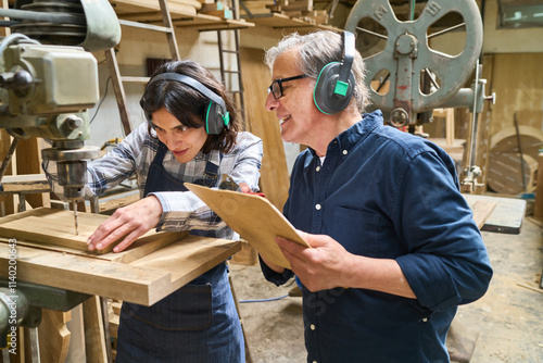 Experienced craftsman teaching young apprentice in a woodworking shop