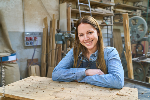 Confident female carpenter in lumberyard workplace smiling