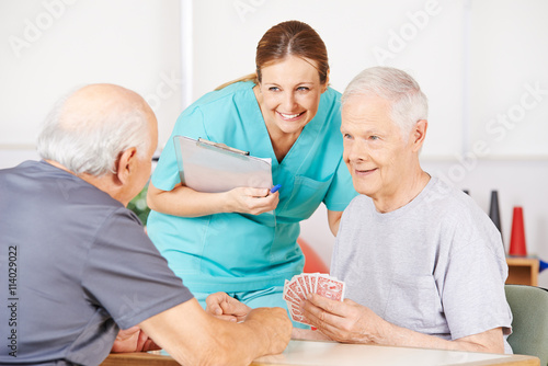 Altenpflegerin schaut Männern beim Kartenspiel zu
