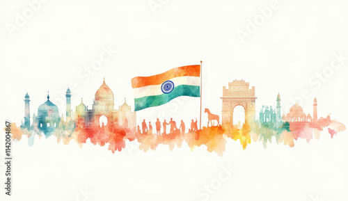 Indian flag waving with iconic landmarks in a colorful digital art style