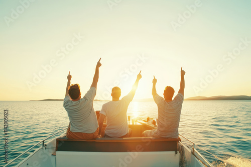 Friends enjoying a boat ride at sunset with joyful expressions