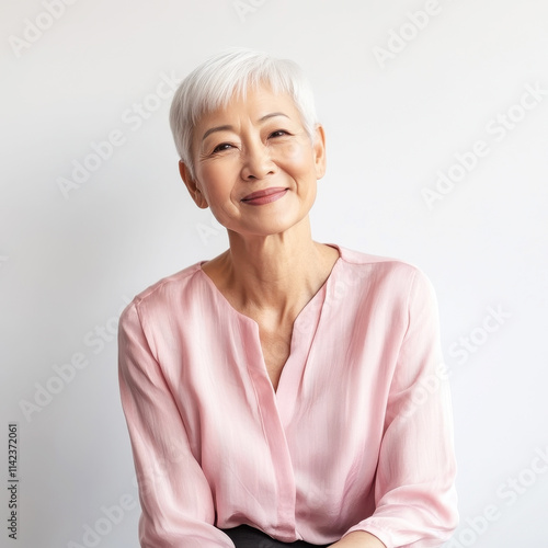 Delighted elderly East Asian woman in her 70s with short white hair smiling against a soft pink background