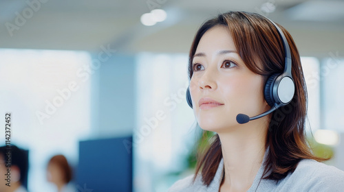 Japanese businesswoman with headset presenting in modern office
