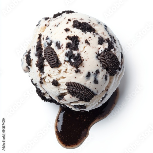 Top view of a single scoop of cookies and cream ice cream isolated on a white background with chocolate cookie pieces