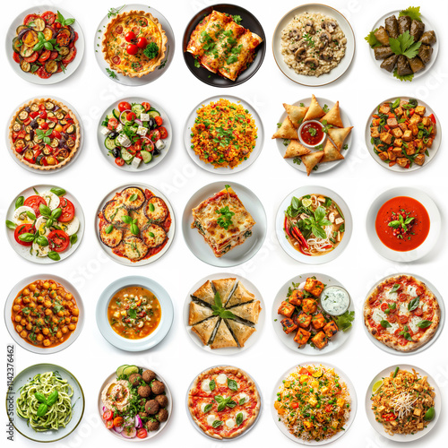 Assorted vegetarian dishes in white plates arranged on a seamless white background