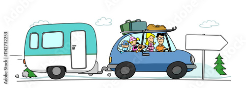 Familie fährt mit Auto und Caravan in den Winterurlaub