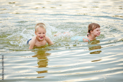 Zwei Kinder plantschen im Wasser