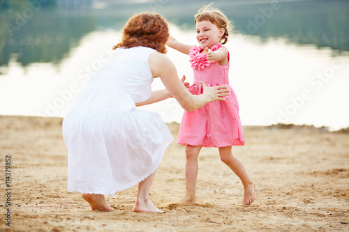 Tochter rennt auf Mutter zu am Strand