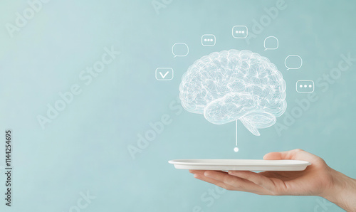 Hand presenting a brain with speech bubbles on a tray against blue background