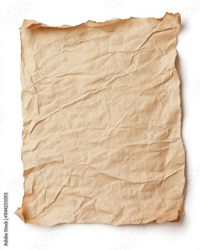 Crumpled antique parchment paper with frayed edges isolated on a white background