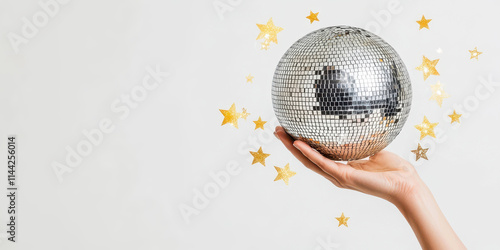Hands Holding a Shiny Disco Ball With Golden Stars in the Background