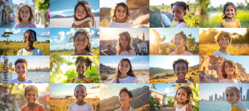 Collection of smiling children outdoors in various scenic backgrounds under sunlight