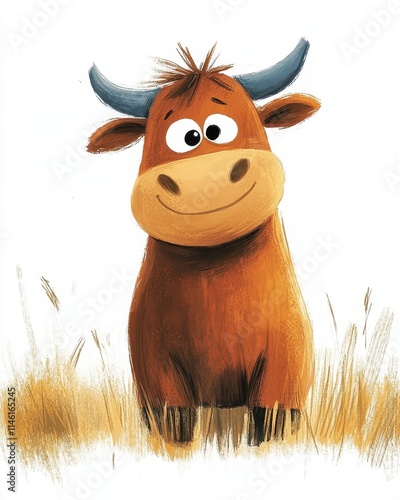 Charming cartoon illustration of a smiling ox standing on grass, inspired by children's book art style for joyful storytelling.