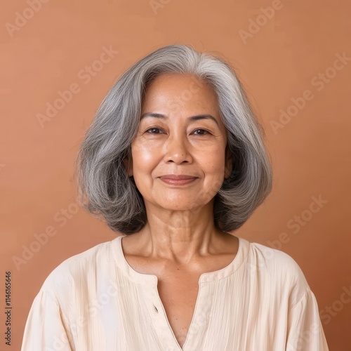 Portrait of a proud senior Thai woman with grey hair smiling
