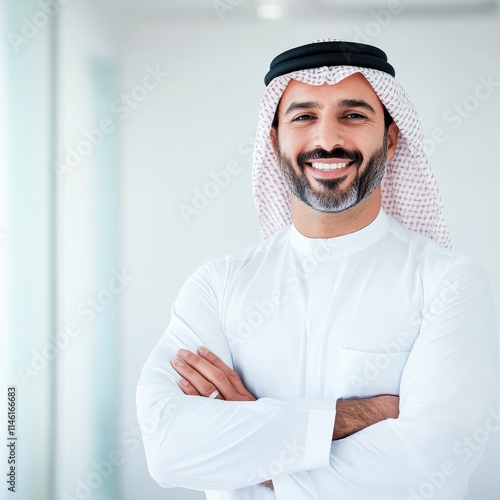 Confident middle-aged Saudi businessman smiling in bright workspace