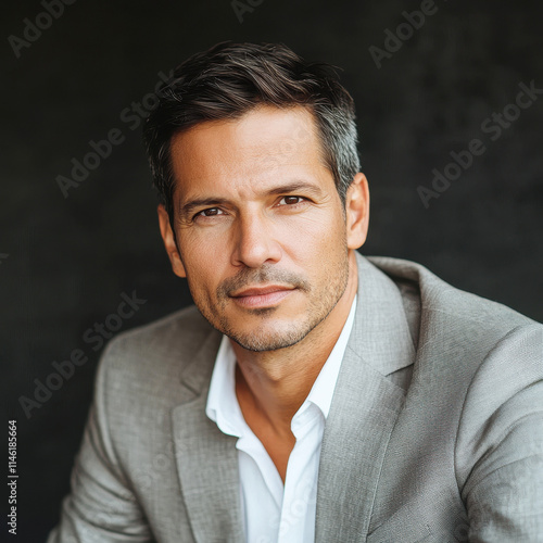Hispanic man in 40s, grey hair, business suit, determined